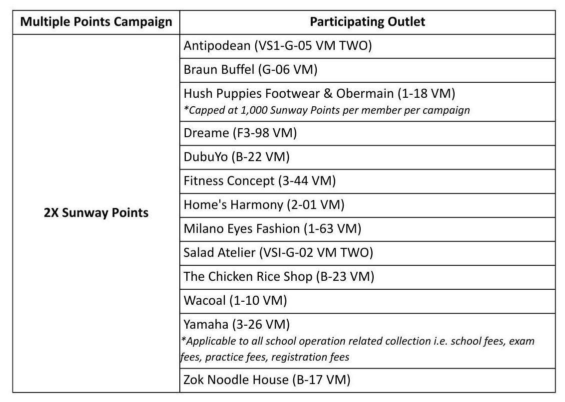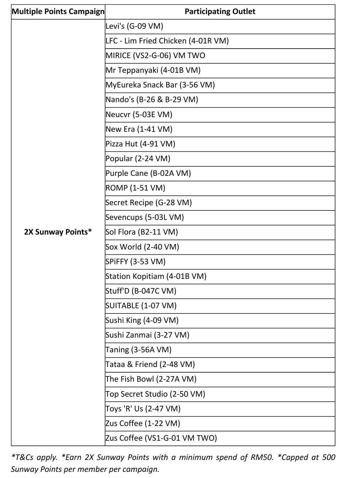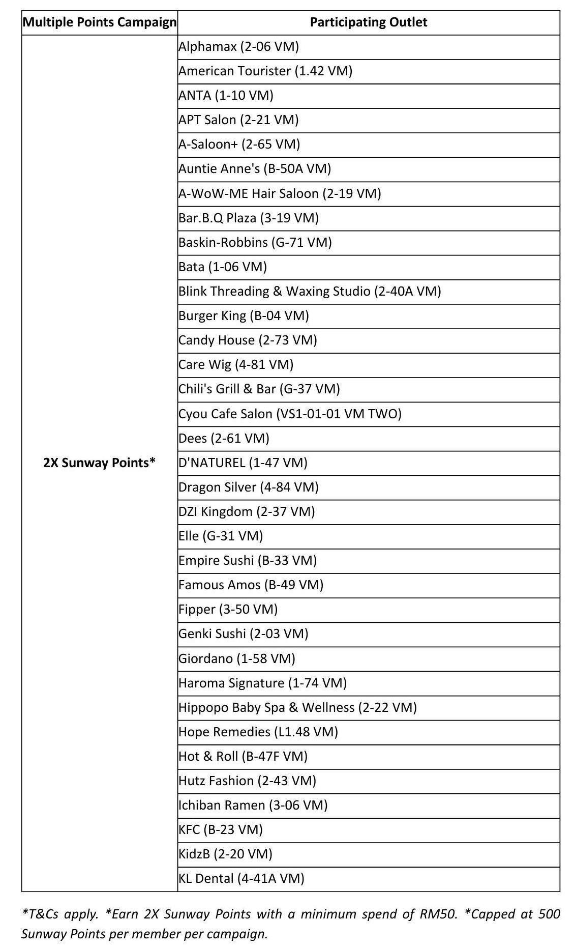 The 2X Sunway Points* reward is applicable only with a minimum spend of RM50, and capped at a maximum of 500 Sunway Points awarded to each member throughout the entire campaign or conclude once in total reaches 2,500,000 Sunway Points, whichever comes first.